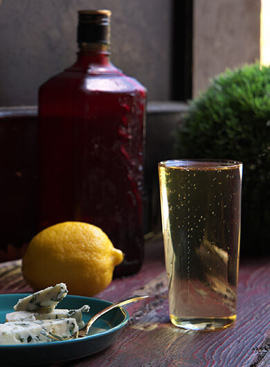 ブルーチーズ- オリジナルブレンドウイスキーを使ったハイボールを、じっくりと飲み進められるようストレートで。青カビのチーズに合わせていると、だんだんと飲みやすくなってくる不思議。その秘密はチーズの辛さとウイスキーのバランス。